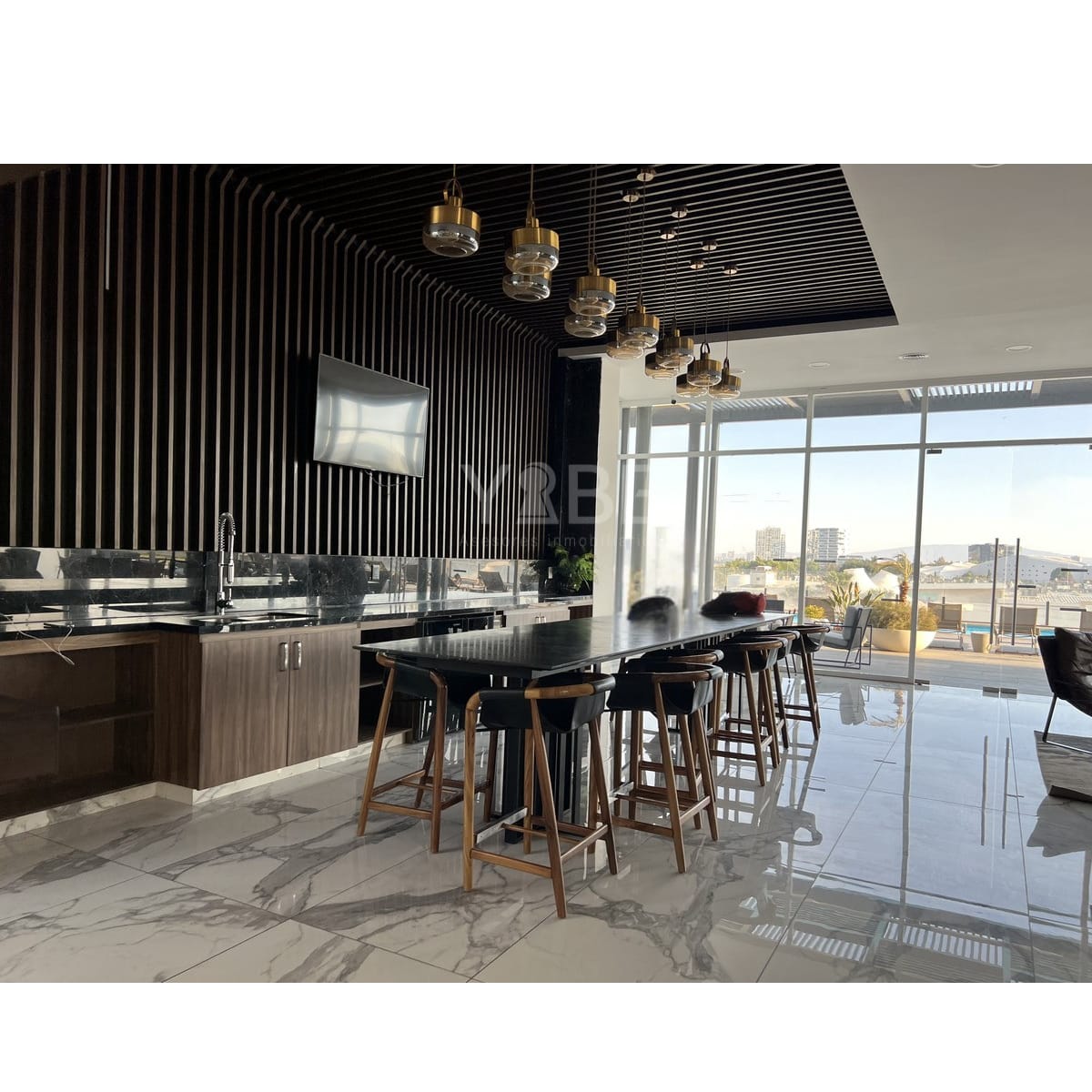 ⏺️ Cocina integral con acabados de lujo y amplia barra desayunadora con cubierta de piedra tecnológica